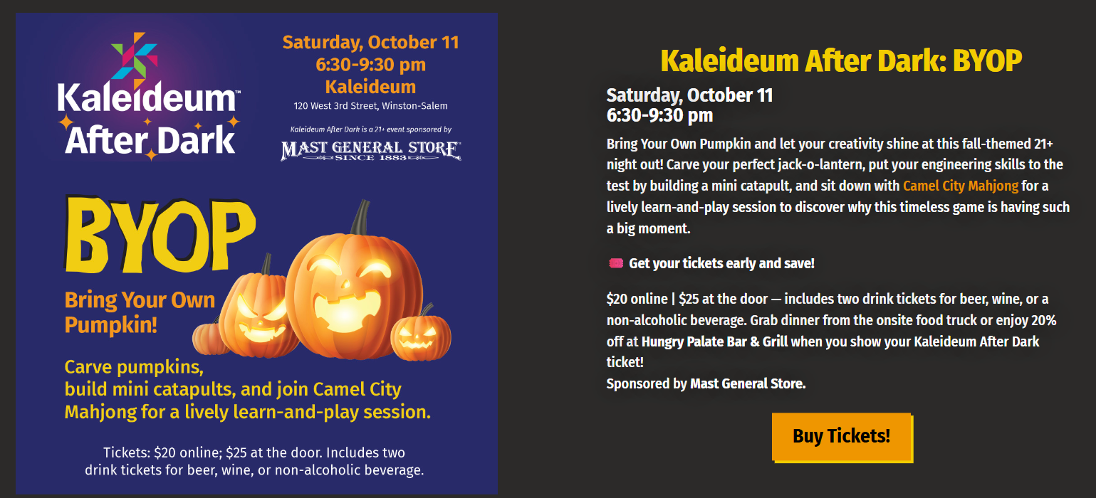 Join NCPA Members and friends in Winston-Salem for an adult night out on Saturday, October 11 from 6:30 – 9:30 pm.